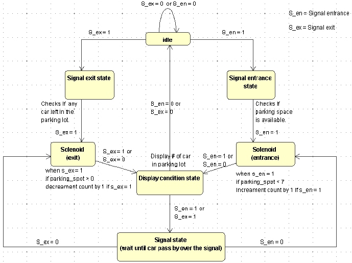 Whenever a car is approaching to the gate for the entrance, a signal from the sensor for the entrance (S_en) is fired off to the system then the system checks if a parking lot is not full. If the parking lot is not full the system enable the solenoid to open the gate. The system makes an increment in the count of the car and displays the result. Whenever a car is approaching to the gate for the exit, a signal from the sensor for the exit (S_ex) is fired off to the system then the system opens the gate. The system makes a decrement in the count of the car and displays the result.