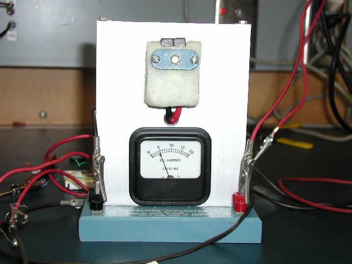 Here are several pictures of our finished prototype. The first picture is of the Peltier Apparatus itself. As you can see, when the apparatus is activated through the transistor relay it is getting a current of around 5 A. This is less than we would have liked, but still enough to get the results we are looking for.