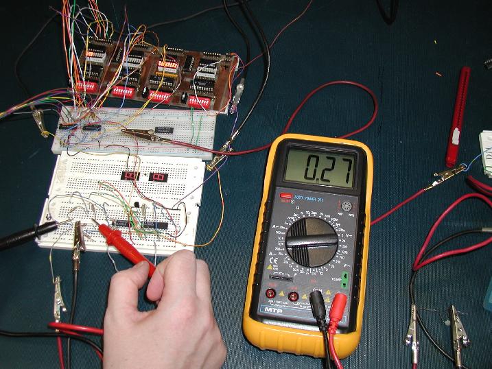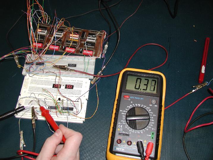 This picture is of the main circuit. The top breadboard contains our comparator circuit, which in this picture is activated. Notice on the debuggerboard how the first set of inputs has several inputs active and that the second has none of the inputs active. This corresponds to the 'On' scenario in our circuit, as should be expected, the device is active. When this picture was taken, the thermistor was at room temperature, and the voltage from our bridge circuit is about 0.27 mV (as can be seen on the multimeter display).